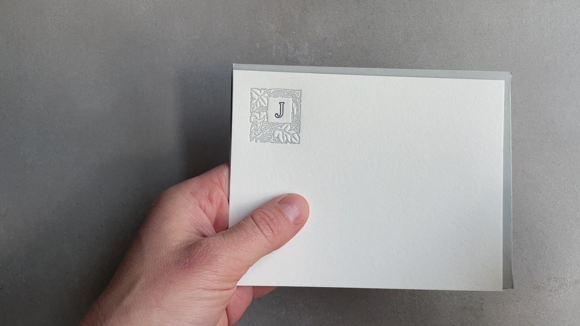 Set of Two-Color, Custom Letterpress Stationery Notecards. Stationery pieces are personalized with your custom initial inside a decorative frame.