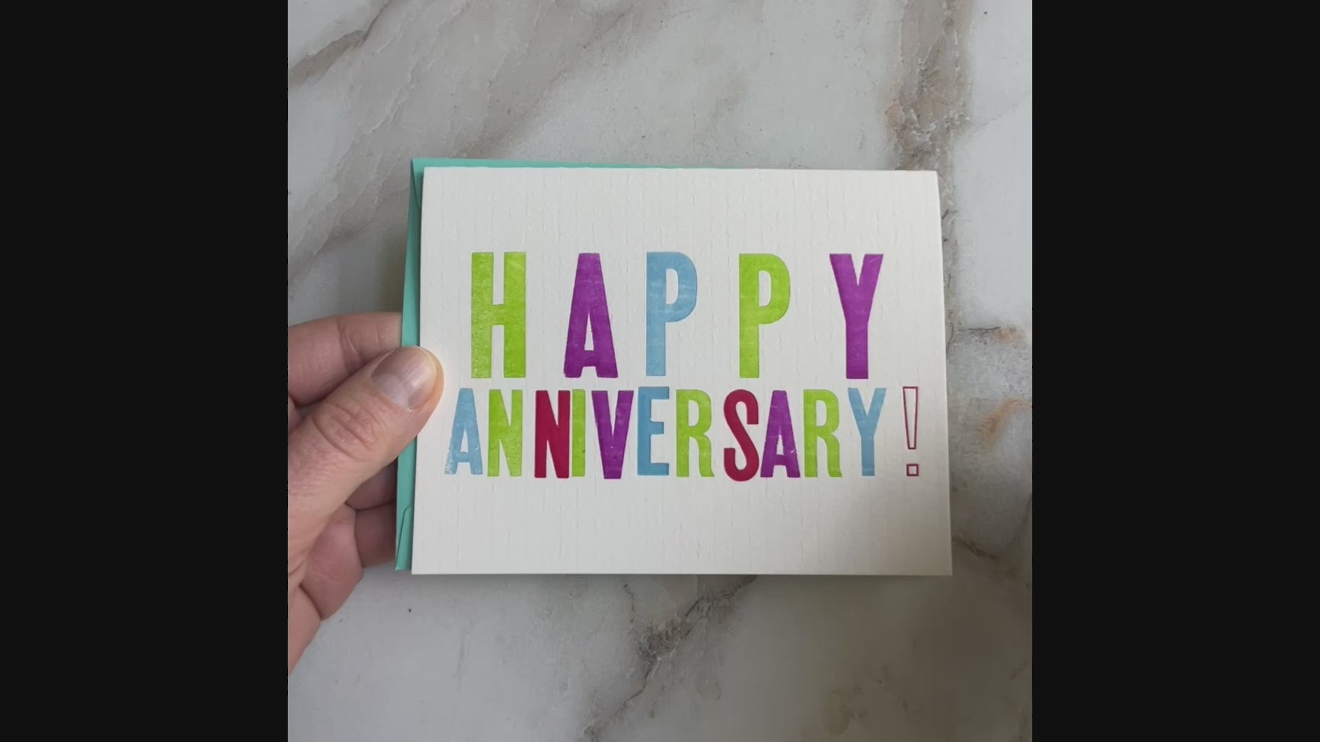Letterpress Folded Card. Give a shout, HAPPY ANNIVERSARY! with this fun card. These four-color cards printed using vintage wood type. A wonderful gift to yourself or the stationery fanatic in your life.