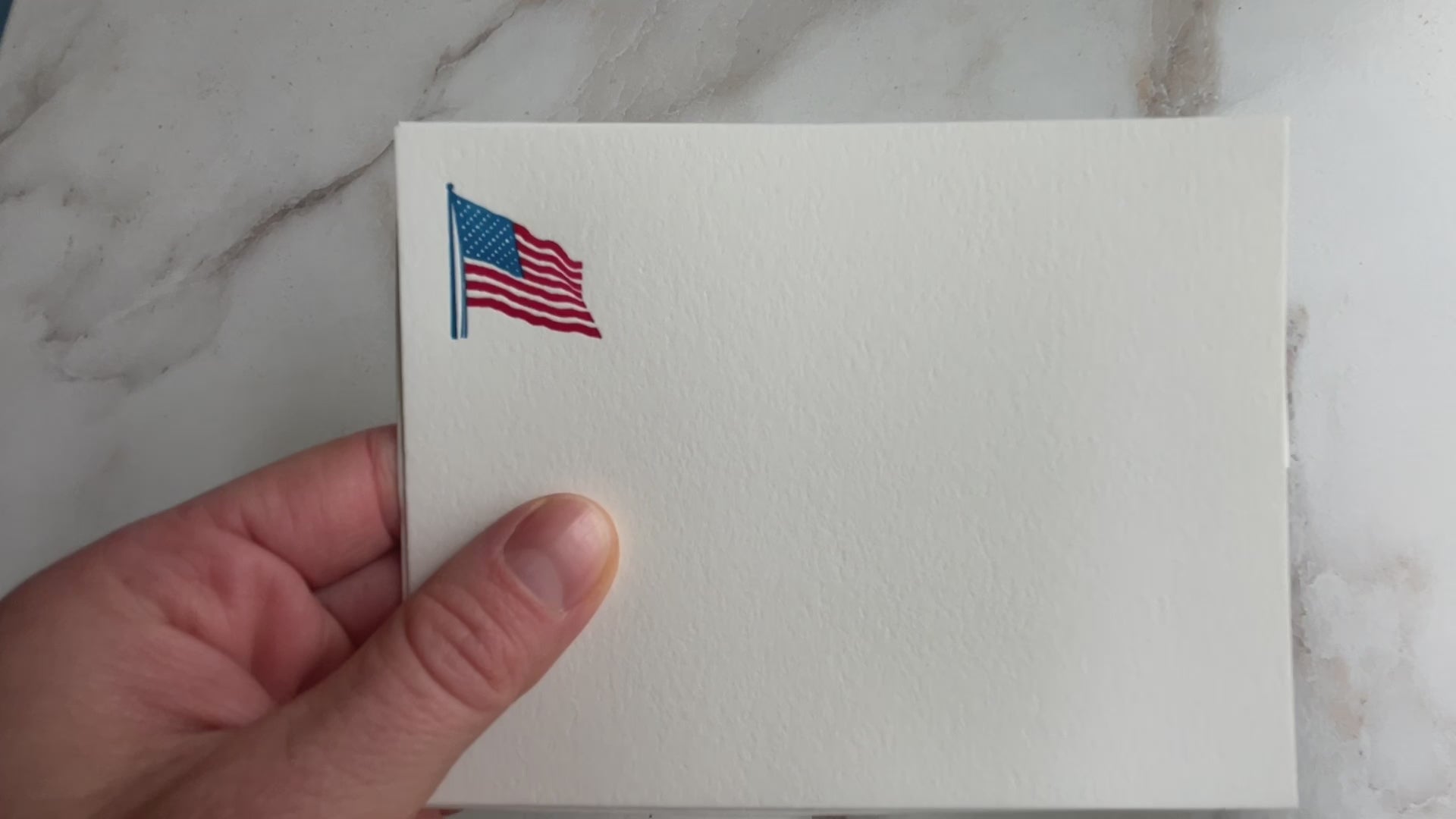 Set of 5 Letterpress Notecards. Each card features an American Flag printed in red & blue ink using vintage letterpress graphics. A wonderful gift to yourself or the stationery fanatic in your life.