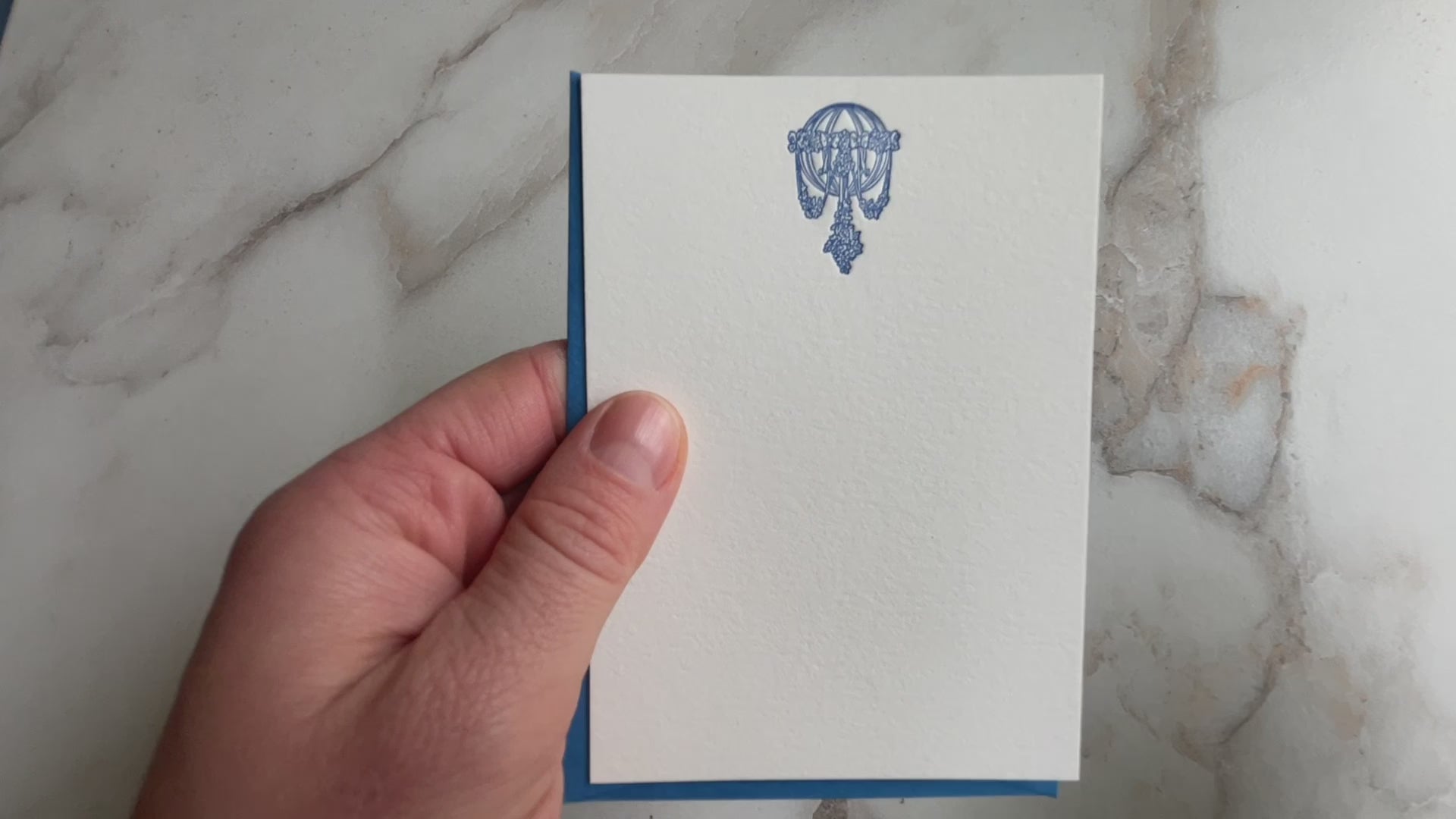 Set of 5 Letterpress Notecards. Cards are printed with an antique letterpress Chandelier graphic. Cards are printed in royal blue ink and come with matching envelopes. A wonderful gift to yourself or the stationery fanatic in your life.