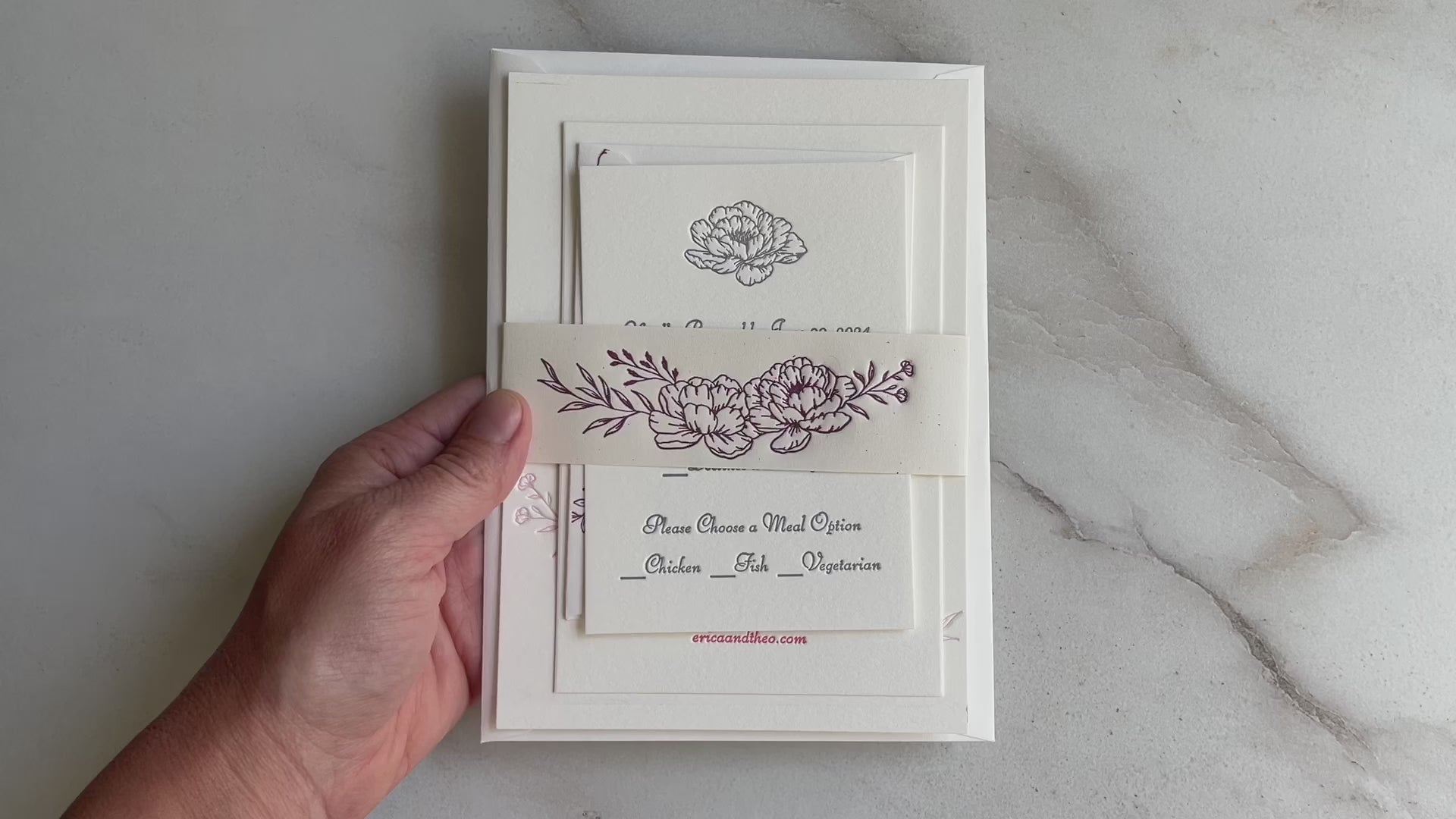Custom Peony Inspired Letterpress Wedding Invitation Stationery Set. Invitation cards are personalized with your custom wedding details. Set comes with your choice of paper weight and color, ink color(s), envelope color, envelope upgrade options such as a colorful paper envelope liner, letterpress printed envelope liner and the option of having a letterpress printed return address on the back of the envelope. Other possible upgrades include a paper belly band as well as a letterpress printed belly band. Belly Bands measure 1.5” in width and wrap around the invitation and are secured with hidden double-sided tape on the back of the band.